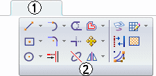 The commands for creating and manipulating sketch elements are located on the Sketching tab (1) in the Draw group (2).