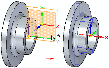 You can select a planar face, reference plane, or principal plane on a coordinate system as the plane for the live section. When you select the plane, a live section is created, similar to a section view in a drawing. When the live section passes through a procedural feature, such as a hole, an edge set is created.