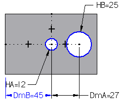Lorsque vous créez des expressions entre des cotes, il n'est pas possible d'utiliser une cote guidée pour déterminer la valeur d'une cote guide lorsque les deux se trouvent au sein de la même esquisse ou du même profil. Par exemple, si les cercles de profil HA et HB pour l'enlèvement illustré se trouvent sur le même plan de profil ou d'esquisse, vous ne pouvez pas utiliser DmA pour déterminer la valeur de DmB, car DmA est une cote guidée. (DmA est une cote guidée car l'emplacement du cercle de profil HA est défini par des relations géométriques entre les points-milieu des arêtes des pièces).
