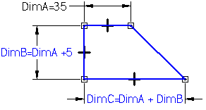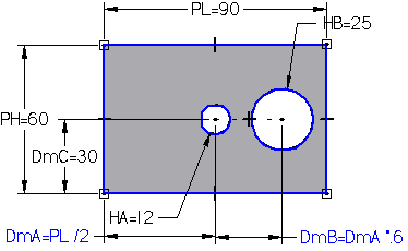 Comme illustré ci-dessous, la modification des relations permet de dessiner les cercles de profil HA et HB sur le même plan de profil, puis d'utiliser DmA dans une expression pour contrôler la valeur de DmB (DmB=DmA*.6). Plutôt que de contrôler l'emplacement du cercle de profil HA à l'aide de relations géométriques, une cote guide qui détermine la longueur de base de la fonction (PL) et une expression sont utilisées pour assurer que le profil HA est centré sur la pièce (DmA=PL/2). Ceci permet de créer une expression dans laquelle DmA détermine DmB.