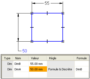 Vous pouvez ensuite indiquer une règle du type liste discrète pour la valeur CoteA où les seules valeurs admises sont {50; 60; 70}. Si vous modifiez la valeur de CoteB pour mettre 55, cette règle n'est pas respectée. La valeur non admise n'est pas appliquée à la CoteA. La cellule Valeur de la CoteA dans la table des variables devient orange pour indiquer qu'il existe un conflit entre la règle et la formule.