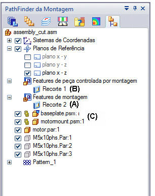 Listas separadas são mantidas no PathFinder para os recursos de montagem (A) e para os recursos de peça controlada por montagem (B). Ao construir recursos de peça controlada por montagem, os símbolos para as peças afetadas (C) são alterados para mostrar que têm links à montagem.