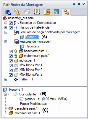 Quando você seleciona um recurso baseado em montagem no painel superior do PathFinder, os pais que controlam o recurso são exibidos no painel inferior do PathFinder. Por exemplo, quando você seleciona Recorte3 (A) no painel superior, o painel inferior mostra que o C.PAR é a peça pai para o plano de referência coincidente em que o perfil foi construído. Também são listadas as peças (C) que foram modificadas pelo recurso.