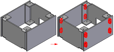 Pode selecionar uma submontagem como o conjunto selecionado de peças a modificar para que todas as peças que intersecionam o recurso sejam modificadas. Se posteriormente são adicionadas peças à submontagem, as novas peças não são adicionadas ao âmbito do recurso. Se deseja que as novas peças participem do recurso, você deve editar o recurso e retornar à etapa Selecionar Peças e escolher as novas peças em que aplicar o recurso.